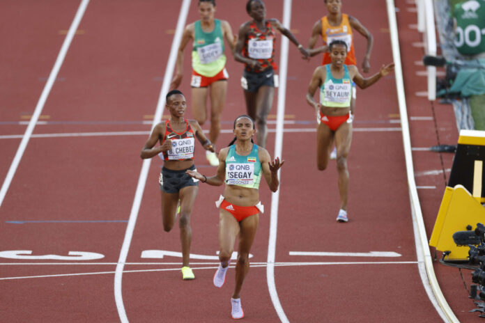 The race, missing former two-time world champion Hellen Obiri of Kenya — who won 10,000m silver behind Ethiopia’s Letesenbet Gidey here, kicked off at a sedate pace as no one seemed willing to take up the challenge.Seyaum was nominally in front, joined on the second lap by Tsegay as the pack was at times four abreast.Gidey also appeared as the Ethiopian trio looked to get a grip on race management.Tsegay, the world indoor 1500m champion, spurted to split the pack, Hassan well toward the back, while Gidey took the pack through the line with six laps to run.With two laps to go of the 12-and-a-half lap race at Hayward Field, the pack had been cut to eight.Hassan made her move in the run-up to the bell for the final lap, but Tsegay responded aggressively, holding on to a narrow lead.Hassan surged again down the back straight on the inside, taking the lead briefly before Tsegay and Chebet drew level and then passed her.In the sprint for the line, Hassan fell further back to ensure her medal-winning prowess at the Doha worlds and Tokyo Olympics was not replicated.