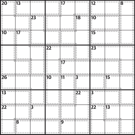 Normal sudoku rules apply, except the numbers in the cells contained within dotted lines add up to the figures in the corner. No number can be repeated within each shape formed by dotted lines.