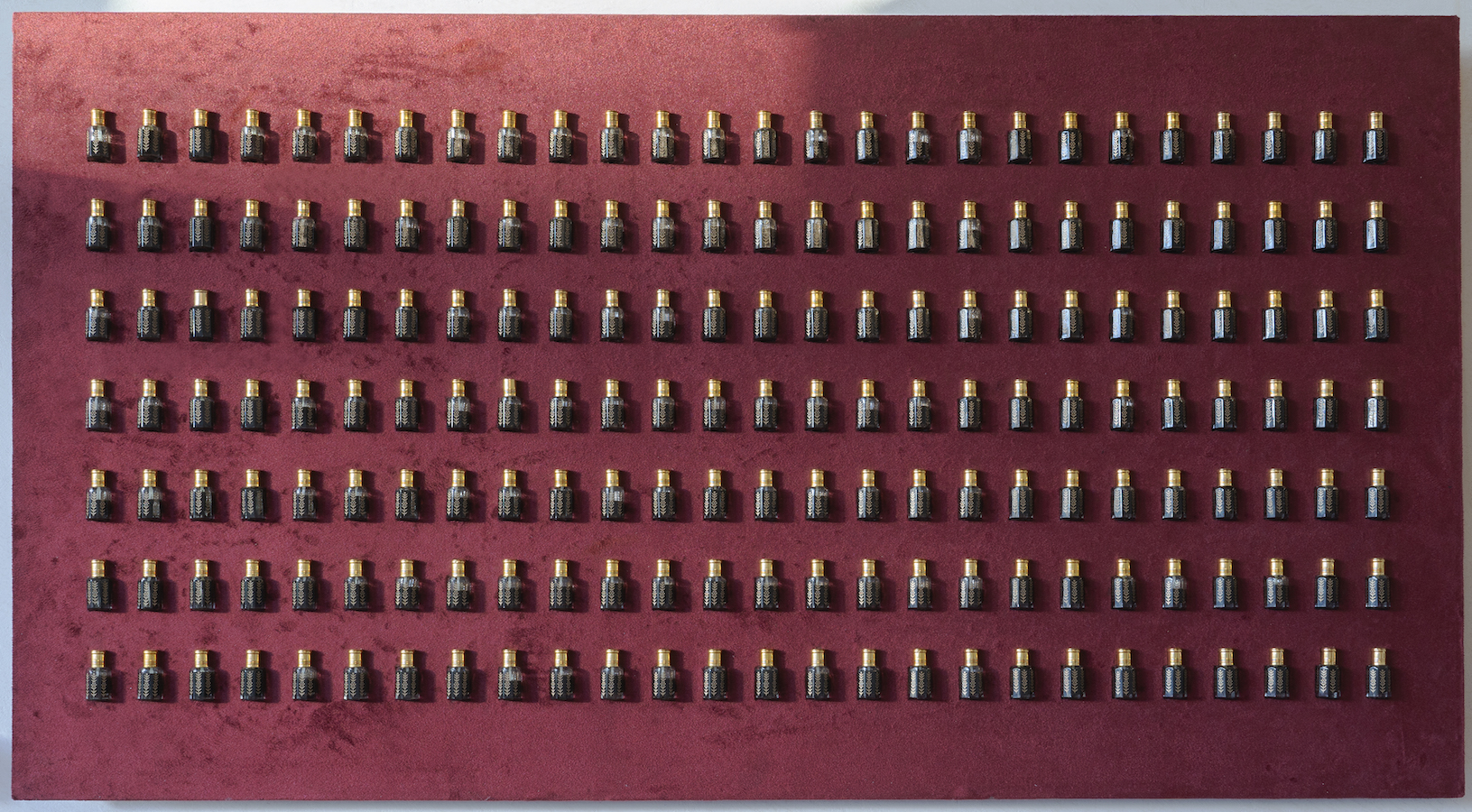 In “Tola Petroleum” (2019), Howede creates a grid consisting of rows of oud bottles filled with petroleum, a sharp look at traditional signifiers of Arabian culture and their interchangeability. It is a neat encapsulation of how this exhibition — as a snapshot of contemporary art practice in Saudi Arabia — indicates that ancestral traditions form a significant part, existing side-by-side with cultural change.