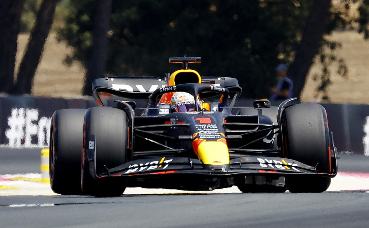 LE CASTELLET, France: World champion and series leader Max Verstappen sizzled in the sun on Saturday when he topped the times for Red Bull ahead of both Ferrari drivers in third and final practice session at the French Grand Prix.Making the most of a superior straight-line speed, the 24-year-old Dutchman clocked a best lap in one minute and 32.272 seconds to outpace Carlos Sainz in the leading Ferrari by three-tenths of a second.Sainz, who claimed his maiden Formula One triumph at the British Grand Prix earlier in July, will start Sunday’s race from the back of the grid alongside Jan Magnussen of Haas after the two Ferrari-powered cars took more new engine parts.Charles Leclerc, who trimmed Verstappen’s advantage in the title race to 38 points by winning the Austrian Grand Prix, was third fastest six-tenths down on the pace.Seven-time champion Lewis Hamilton was fourth for Mercedes ahead of Sergio Perez in the second Red Bull and George Russell, in the second Mercedes.It was a measure of Verstappen’s dominant pace that he was more than a second quicker than his Red Bull team-mate on another hot day in the south of France.Two-time champion Fernando Alonso was seventh for Alpine with a late lap to lift him ahead of Alex Albon of Williams, Lando Norris of McLaren and Yuki Tsunoda of Alpha Tauri.Both German drivers Mick Schumacher and four-time champion Sebastian Vettel endured difficult sessions and wound up 19th and 20th respectively for the Haas and Aston Martin teams after completing only 12 and 11 laps.In scorching conditions, the session began with only seven cars venturing out and Perez setting the first lap time in 1:33.628 after seven minutes — a time obliterated immediately by Verstappen in 1:32.837 — but little else for the sell-out holiday crowd to enjoy.As the air temperature rose to 34 degrees, the fans raised a cheer for Pierre Gasly as he passed the grandstand named after him before the Mercedes set times more than 1.5 seconds adrift of the champion. “1.7?” said Hamilton. “Jeeze…”Ferrari were also struggling to match the Red Bull pace and Leclerc, pushing hard, spun through a full 360 degrees on his hard tires before Hamilton and Yuki Tsunoda of Alfa Romeo each survived brief ‘moments’ in pursuit.Vertappen’s pace on medium tires remained the standard to catch as his rivals tested ‘softs’ and ‘hards’ before galvanizing themselves for a late flurry of qualifying simulation runs.With 12 minutes remaining, both Leclerc and Sainz had improved to second and third, but were still 0.1 seconds adrift, with Hamilton fourth, four-tenths down. At this time, Red Bull were still to use soft tires.The stubborn Sainz persisted and went top after 51 minutes of the hour, replacing Verstappen in 1:32.626, an advantage of 0.182 to enthuse the ‘prancing horse’ fans sweltering in the open grandstands.Finally taking softs, Verstappen re-joined the fray to beat the Spaniard by 0.354 seconds while Leclerc conceded his tires were ‘dead’, a familiar Ferrari problem at the high-degradation Paul Ricard circuit.By this time, the track temperature was 57 degrees — hot enough to pose a serious challenge to cars, drivers and teams and certain to make strategy a major factor in Sunday’s race.